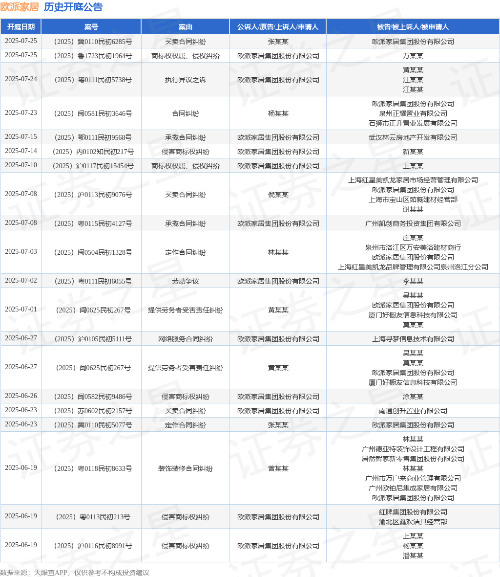 案号:(2025)苏0117民初2745号审理法院:南京市溧水区人民法院案由:装饰装修合同纠纷当事人信息: 原告/上诉人:欧派家居集团股份有限公司 被告/被上诉人:南京颐成房地产开发有限公司开庭日期:2025年6月17日根据统计,近一年内以欧派家居集团股份有限公司为当事人的历史开庭公告有342则,其中案由为“侵害商标权纠纷”的公告以64则居首,其次为“买卖合同纠纷”有62则,“承揽合同纠纷”有61则。历史开庭公告(前20条)如下: